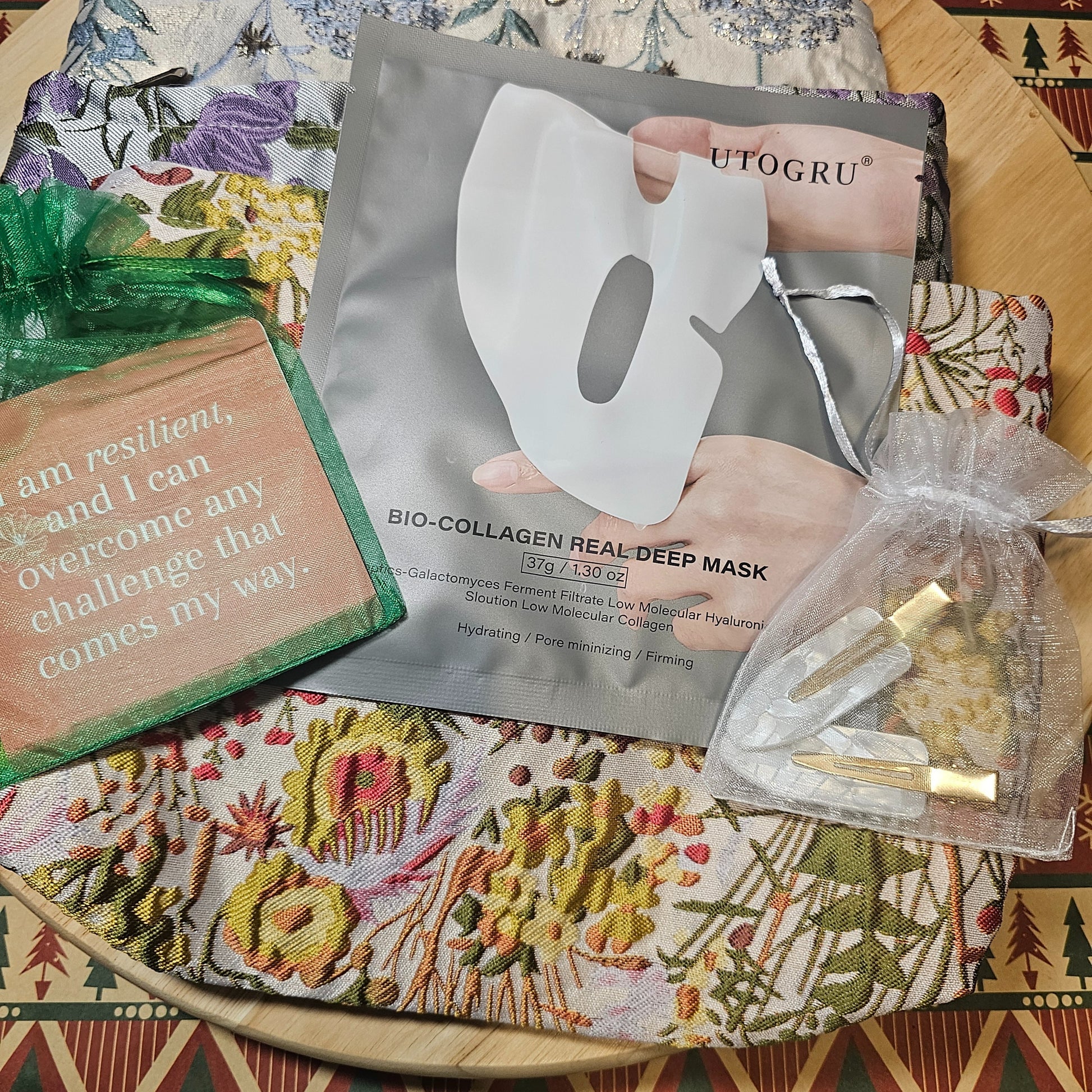 Treat yourself or someone special to the ultimate holiday self-care experience with the *Blossom & Breathe Holiday Pamper Kit* from Regarding You Mindful Care. This limited edition gift set includes a beautifully embroidered floral cosmetic bag, a rejuvenating deep collagen face mask, a stylish hair clip, inspiring shower affirmations, and a soothing guided meditation exercise. Available in four distinct styles, this thoughtful bundle is designed to help you unwind, refresh, and find peace amidst the holiday bustle. Perfect for gifting or a personal indulgence.