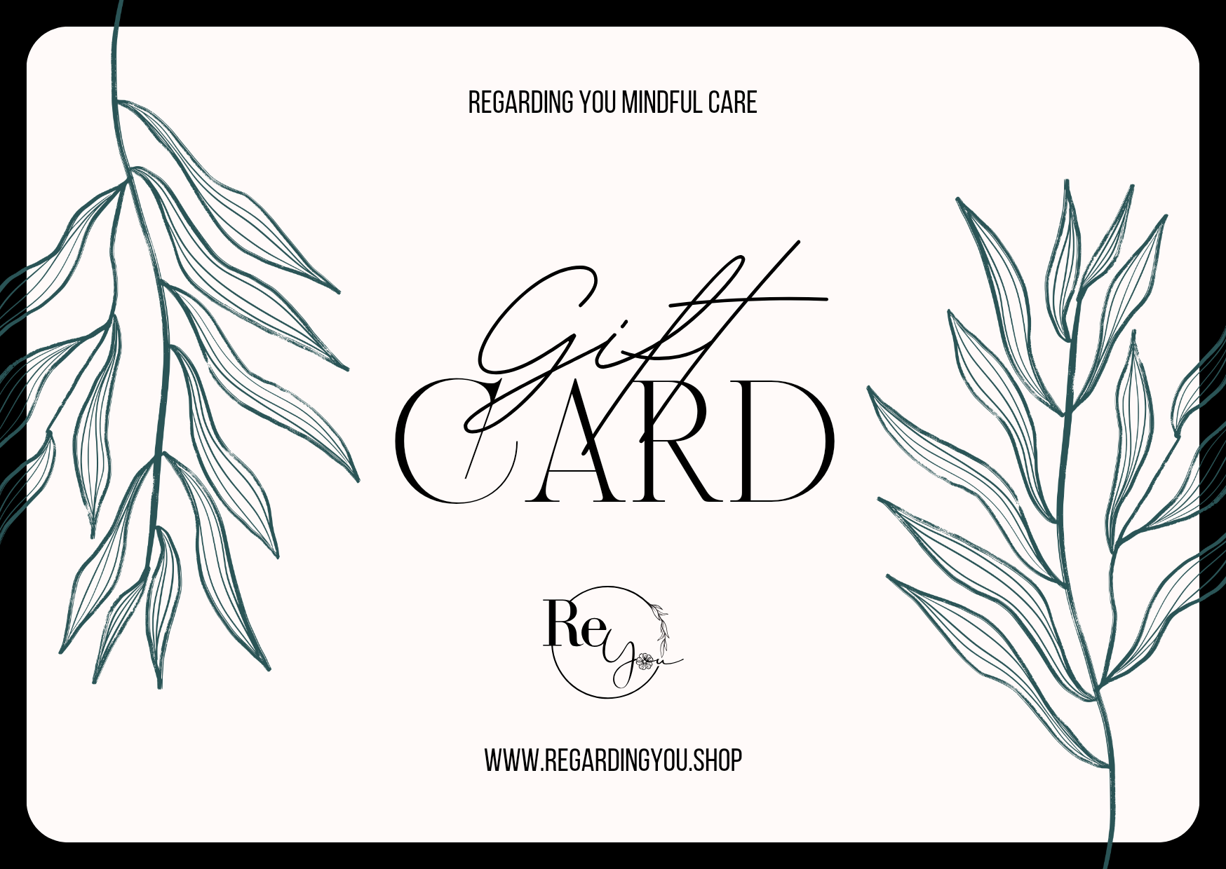 "Gift the Gift of Self-Care: Regarding You Mindful Care Gift Card – Nourish the Soul, Nurture the Mind. Give the present of tranquility and well-being with a thoughtful gesture from Regarding You. Elevate someone's self-care journey with a touch of mindfulness and a dash of serenity. It's not just a gift card; it's an invitation to prioritize mental health and embrace moments of bliss. Because when it comes to caring for yourself or a loved one, Regarding You knows just how to make it truly special."